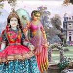 Radha is wearing anklets and toe rings of flowers and Her braid is also decorated with a variety of colored flowers (whose scent, mixed with the scent of Her hair, is spreading a wave of loving rejoicement in the atmosphere).