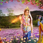 A peacock feather diadem is gently swaying on Your head, and, a decorative bright mark of saffron is beautifying Your forehead.